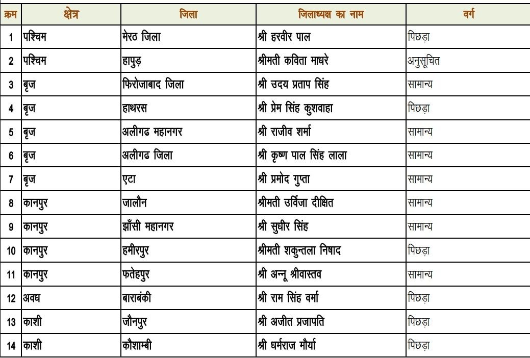 UP के 14 जिलों में BJP जिलाध्यक्ष की घोषणा